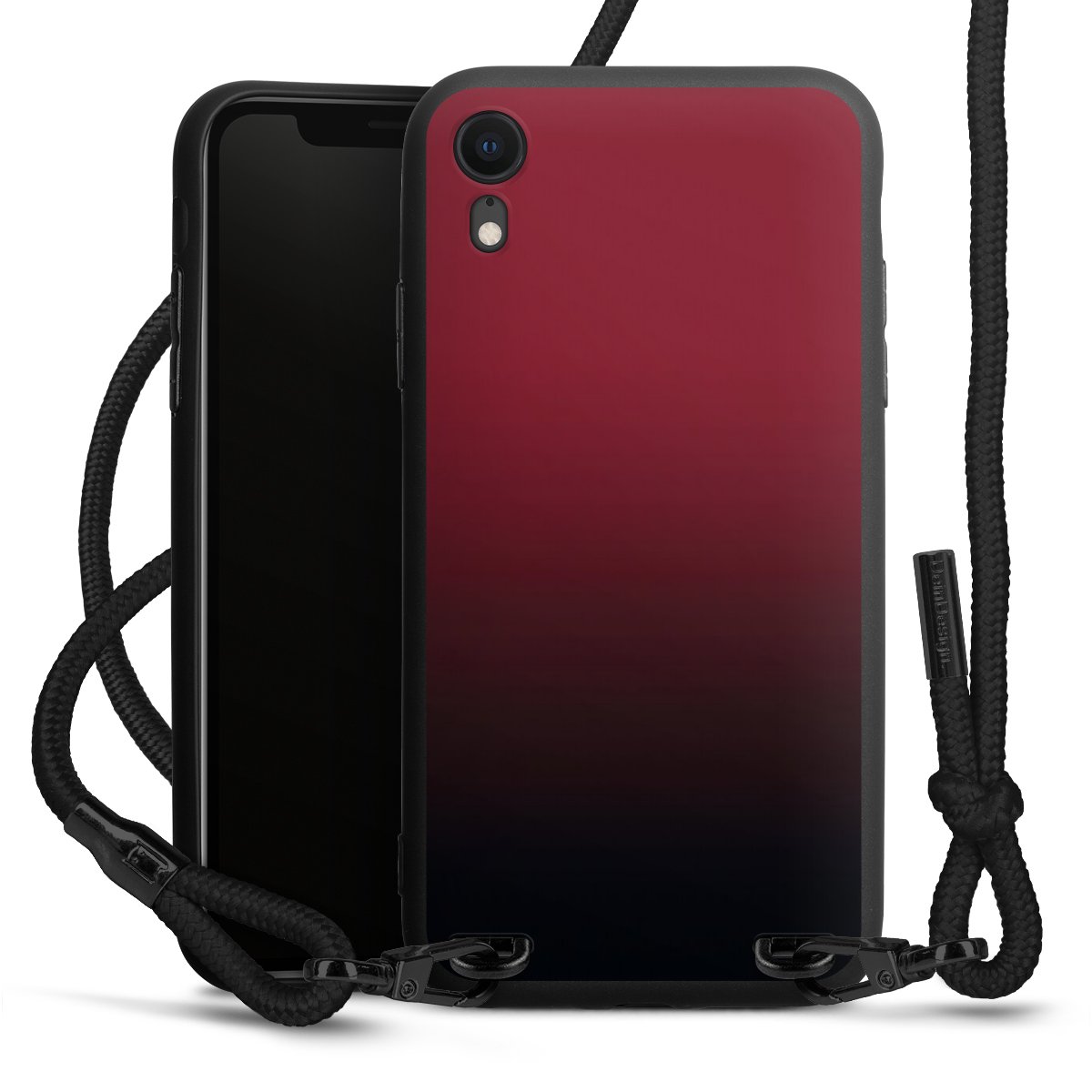 Pure Black: Handyhülle, Stoffband und Metalldetails in stylischem Mattschwarz.