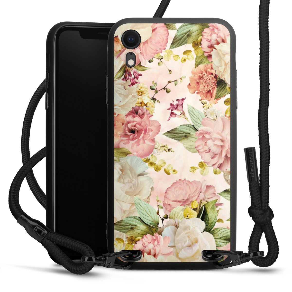 Pure Black: Handyhülle, Stoffband und Metalldetails in stylischem Mattschwarz.