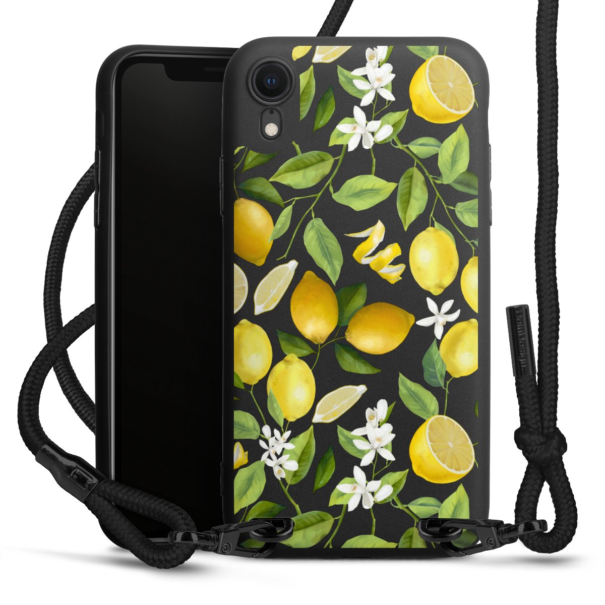 Pure Black: Handyhülle, Stoffband und Metalldetails in stylischem Mattschwarz.