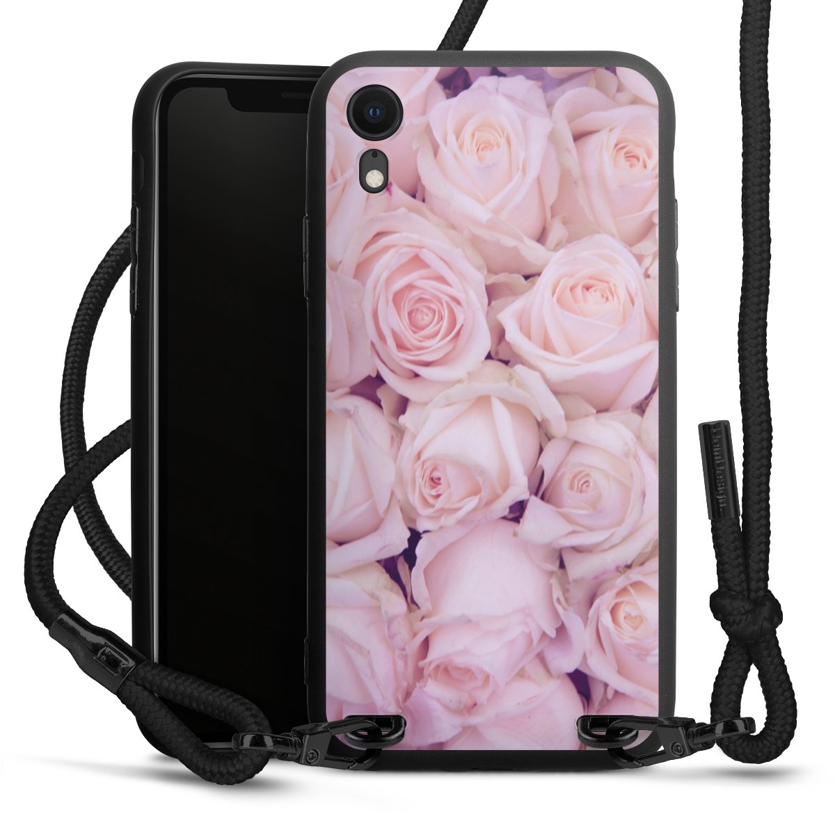 Pure Black: Handyhülle, Stoffband und Metalldetails in stylischem Mattschwarz.
