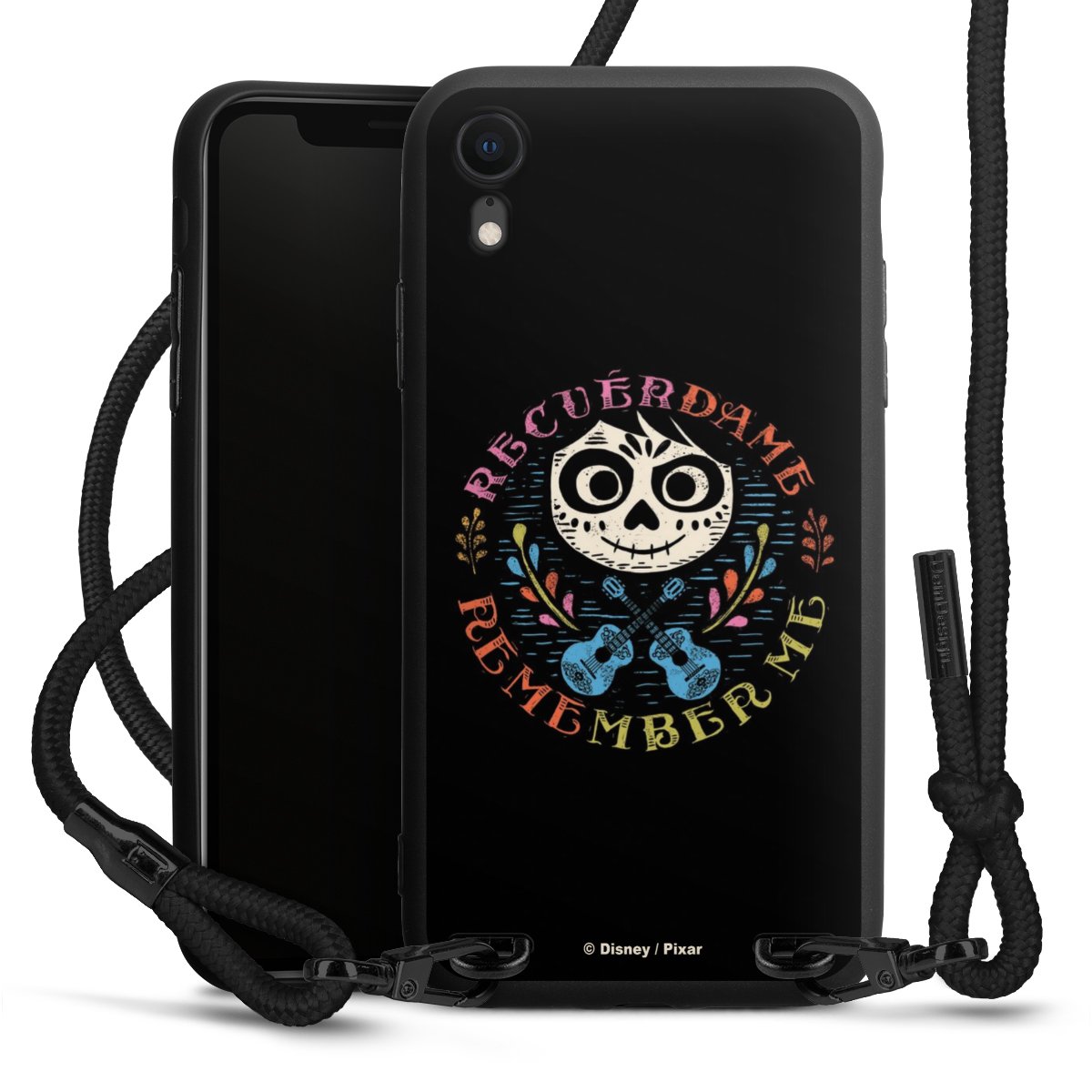 Pure Black: Handyhülle, Stoffband und Metalldetails in stylischem Mattschwarz.