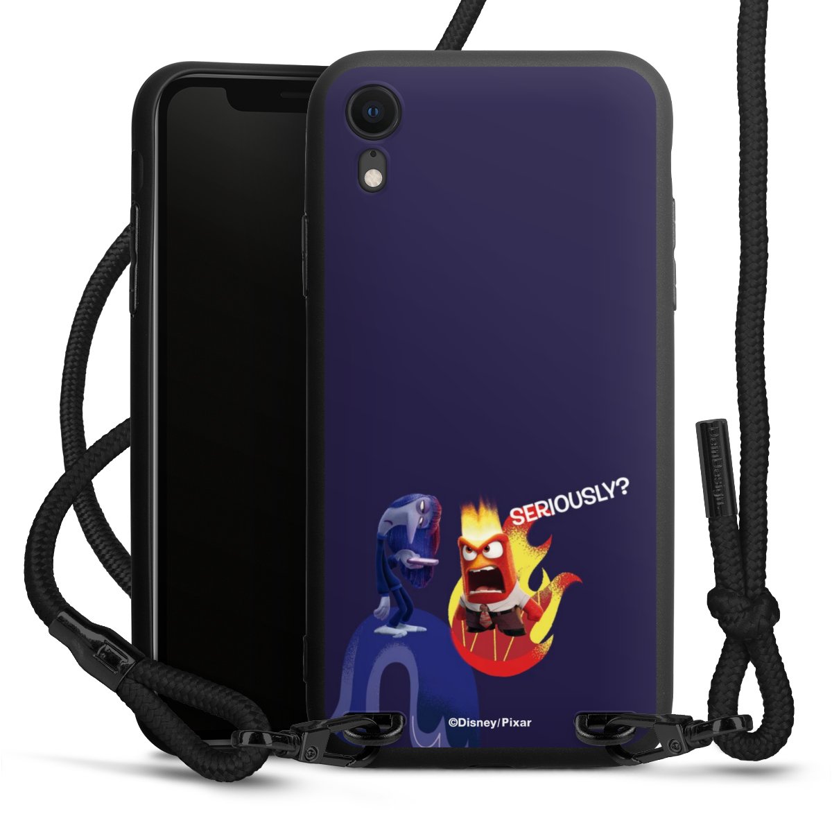 Pure Black: Handyhülle, Stoffband und Metalldetails in stylischem Mattschwarz.