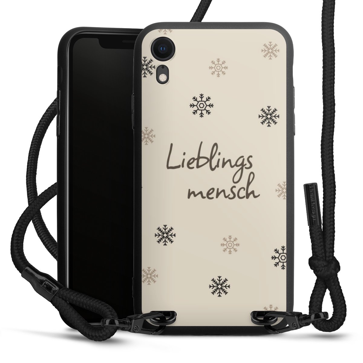 Pure Black: Handyhülle, Stoffband und Metalldetails in stylischem Mattschwarz.