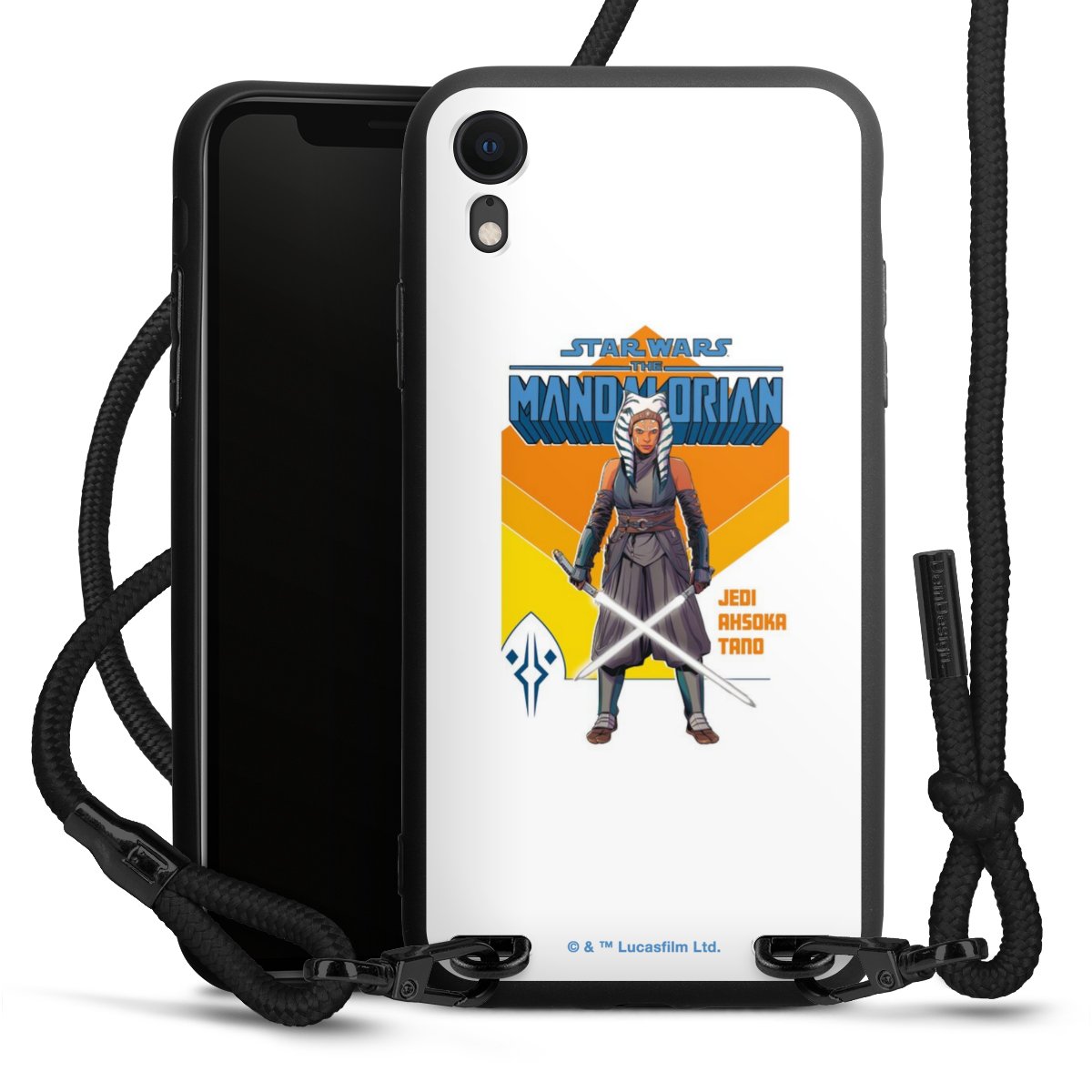 Pure Black: Handyhülle, Stoffband und Metalldetails in stylischem Mattschwarz.