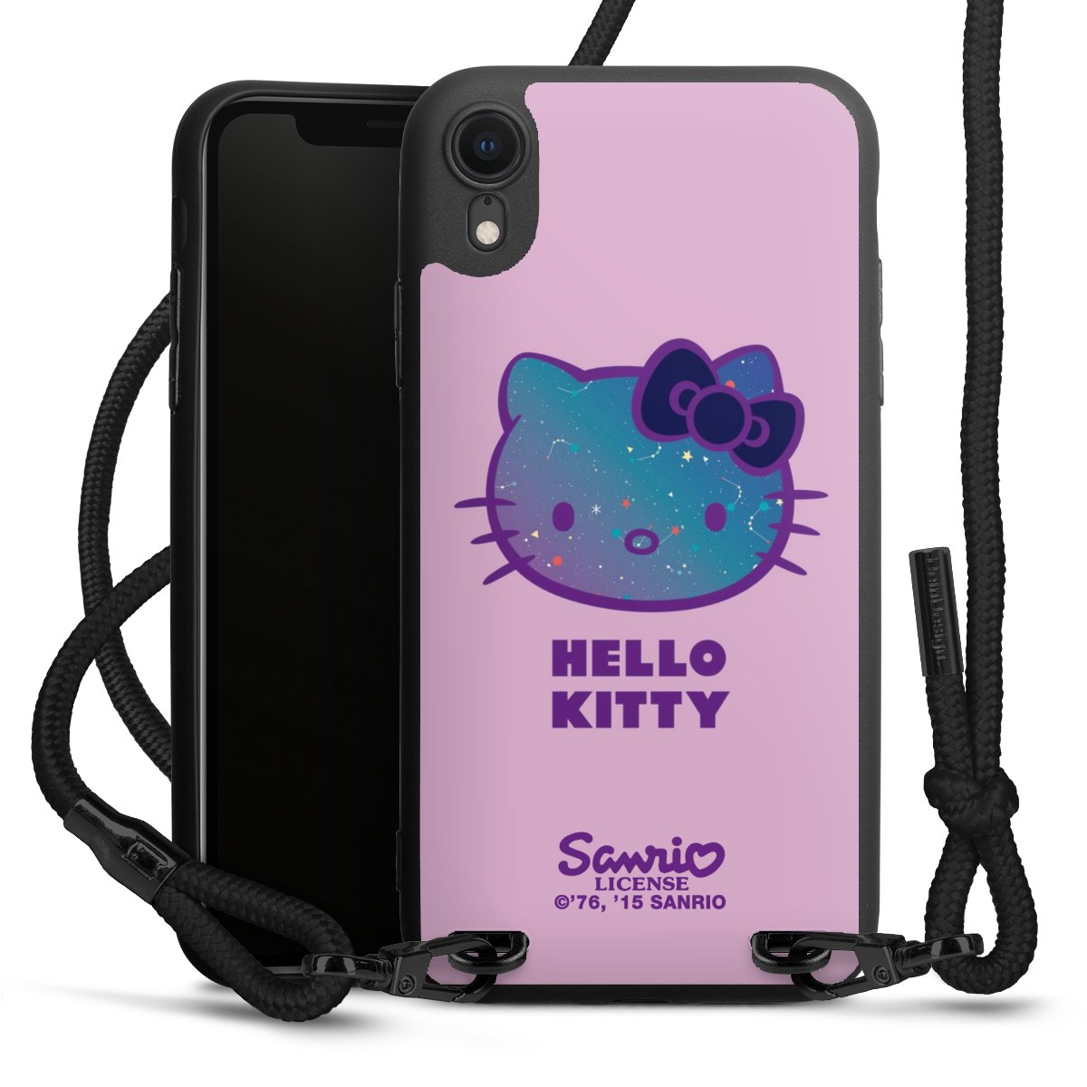 Pure Black: Handyhülle, Stoffband und Metalldetails in stylischem Mattschwarz.