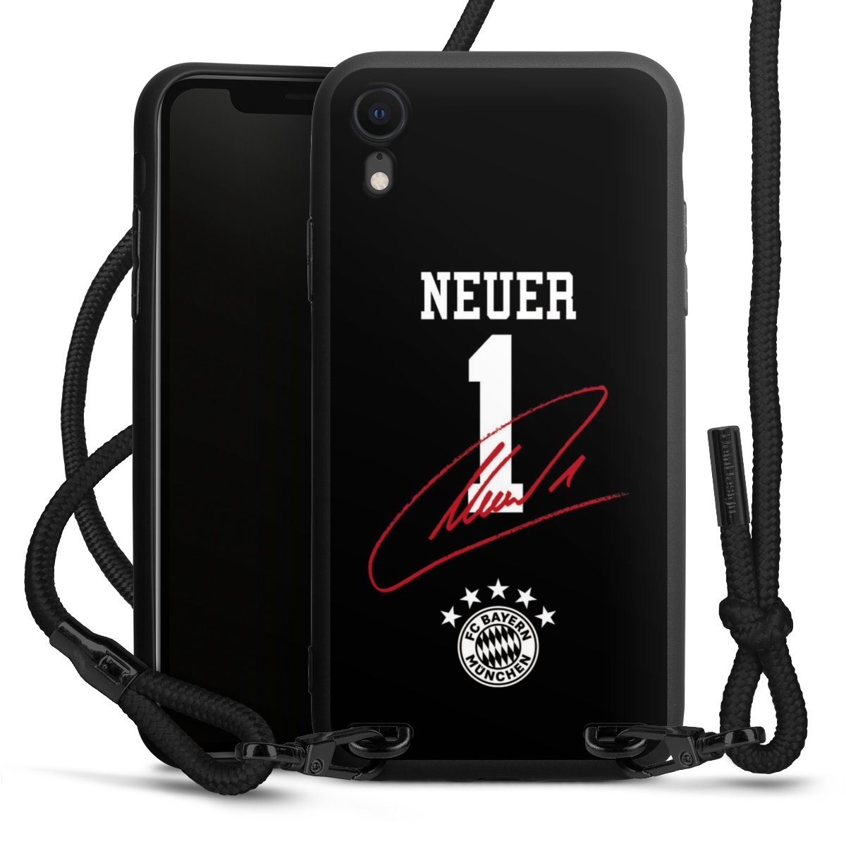 Pure Black: Handyhülle, Stoffband und Metalldetails in stylischem Mattschwarz.
