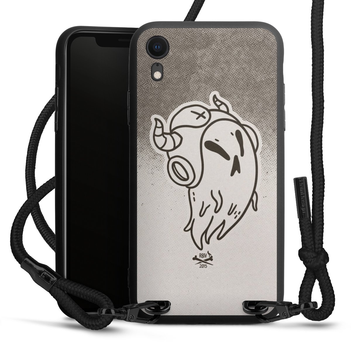 Pure Black: Handyhülle, Stoffband und Metalldetails in stylischem Mattschwarz.
