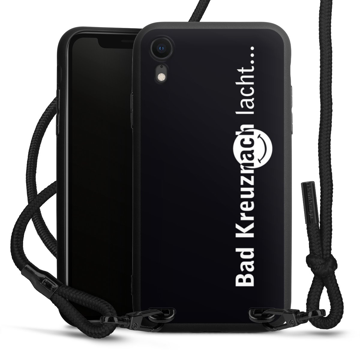 Pure Black: Handyhülle, Stoffband und Metalldetails in stylischem Mattschwarz.