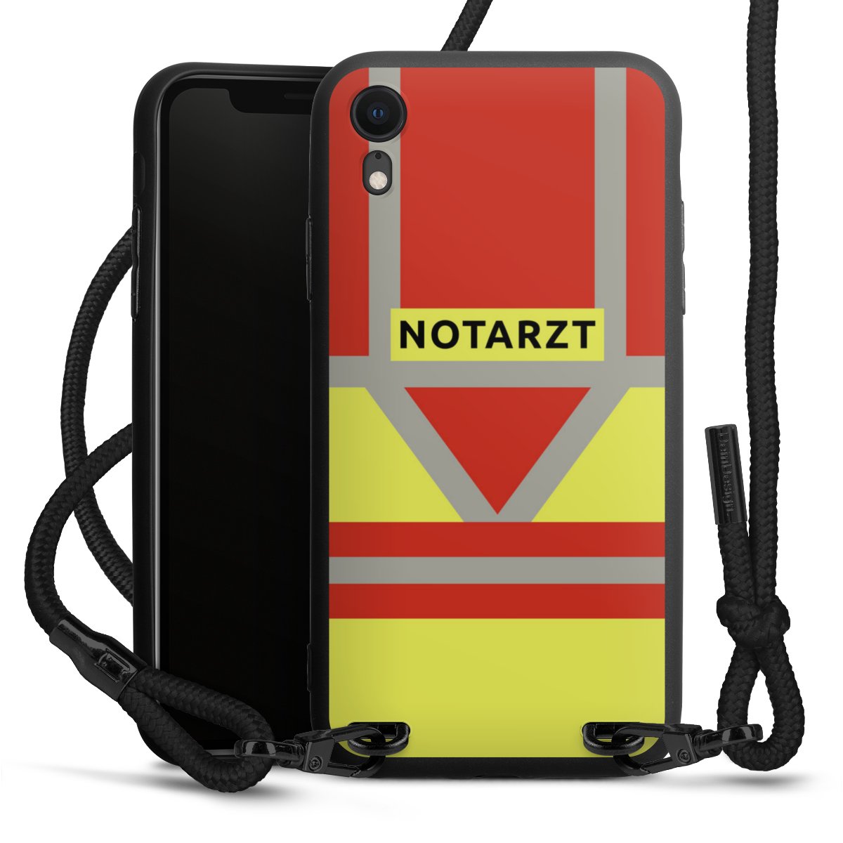 Pure Black: Handyhülle, Stoffband und Metalldetails in stylischem Mattschwarz.