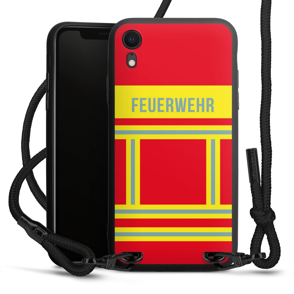 Pure Black: Handyhülle, Stoffband und Metalldetails in stylischem Mattschwarz.