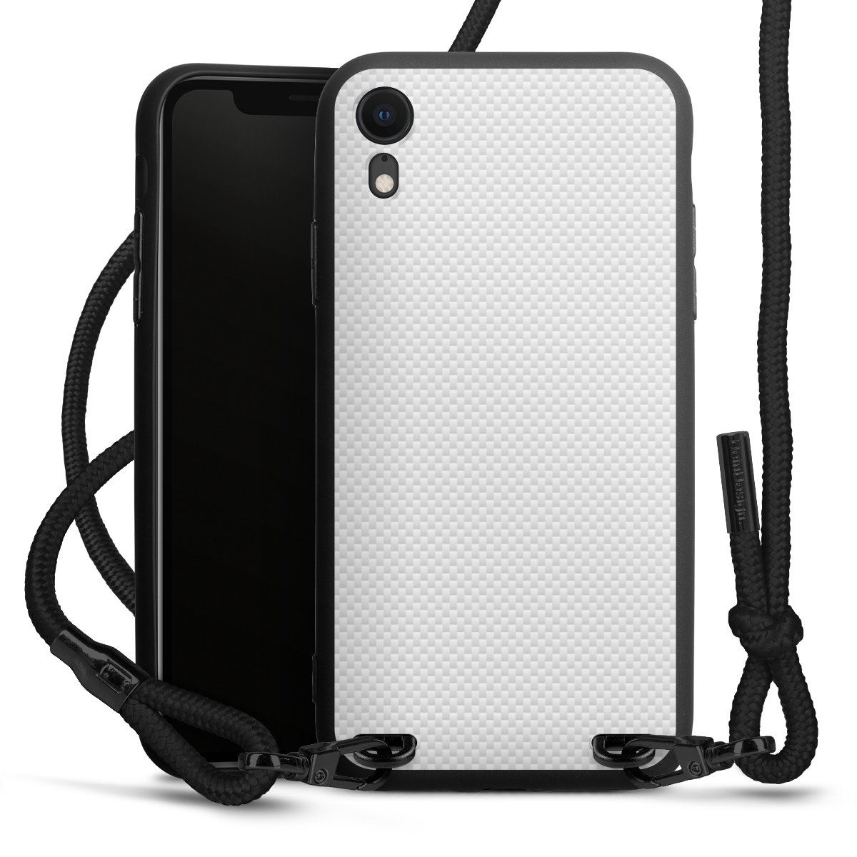 Pure Black: Handyhülle, Stoffband und Metalldetails in stylischem Mattschwarz.