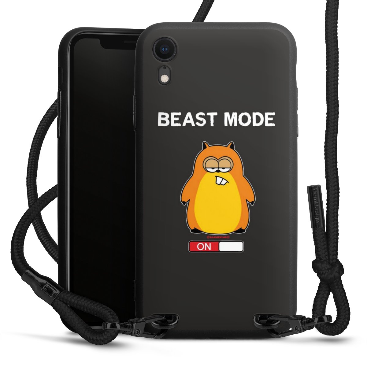 Pure Black: Handyhülle, Stoffband und Metalldetails in stylischem Mattschwarz.