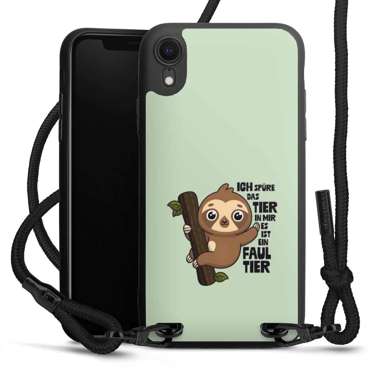 Pure Black: Handyhülle, Stoffband und Metalldetails in stylischem Mattschwarz.