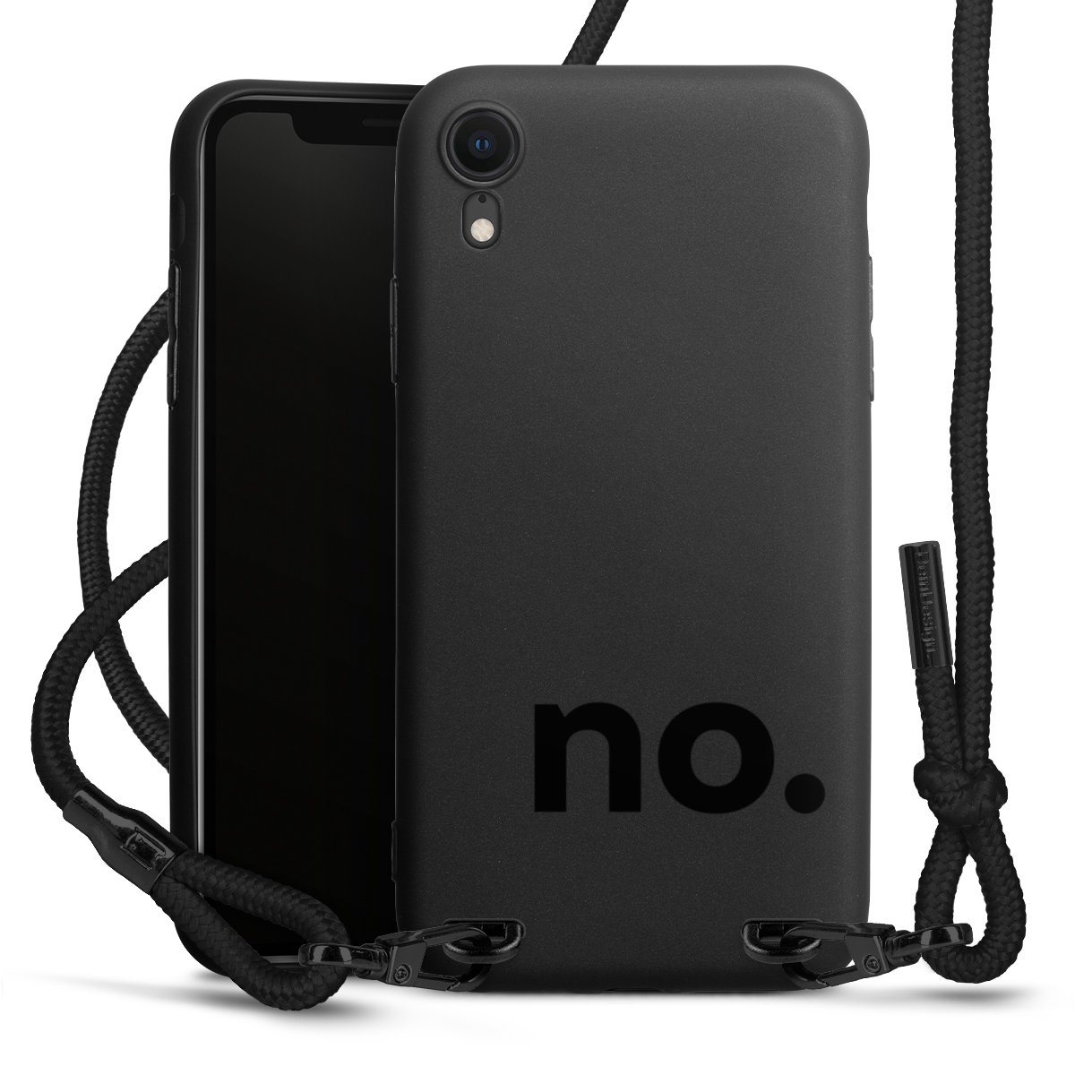 Pure Black: Handyhülle, Stoffband und Metalldetails in stylischem Mattschwarz.