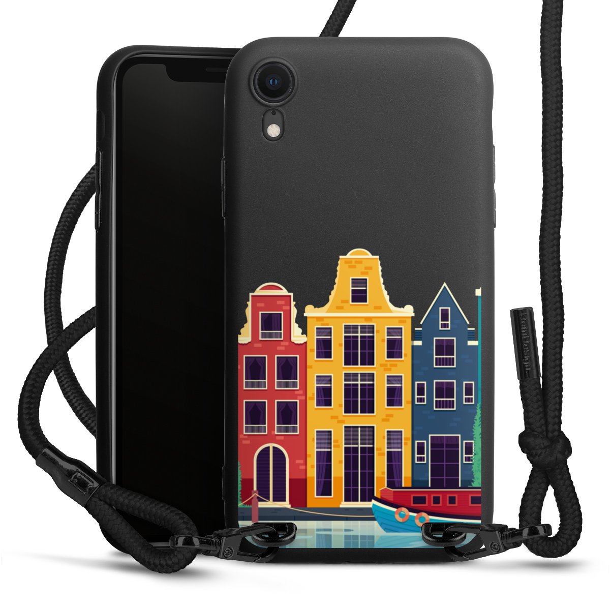 Pure Black: Handyhülle, Stoffband und Metalldetails in stylischem Mattschwarz.