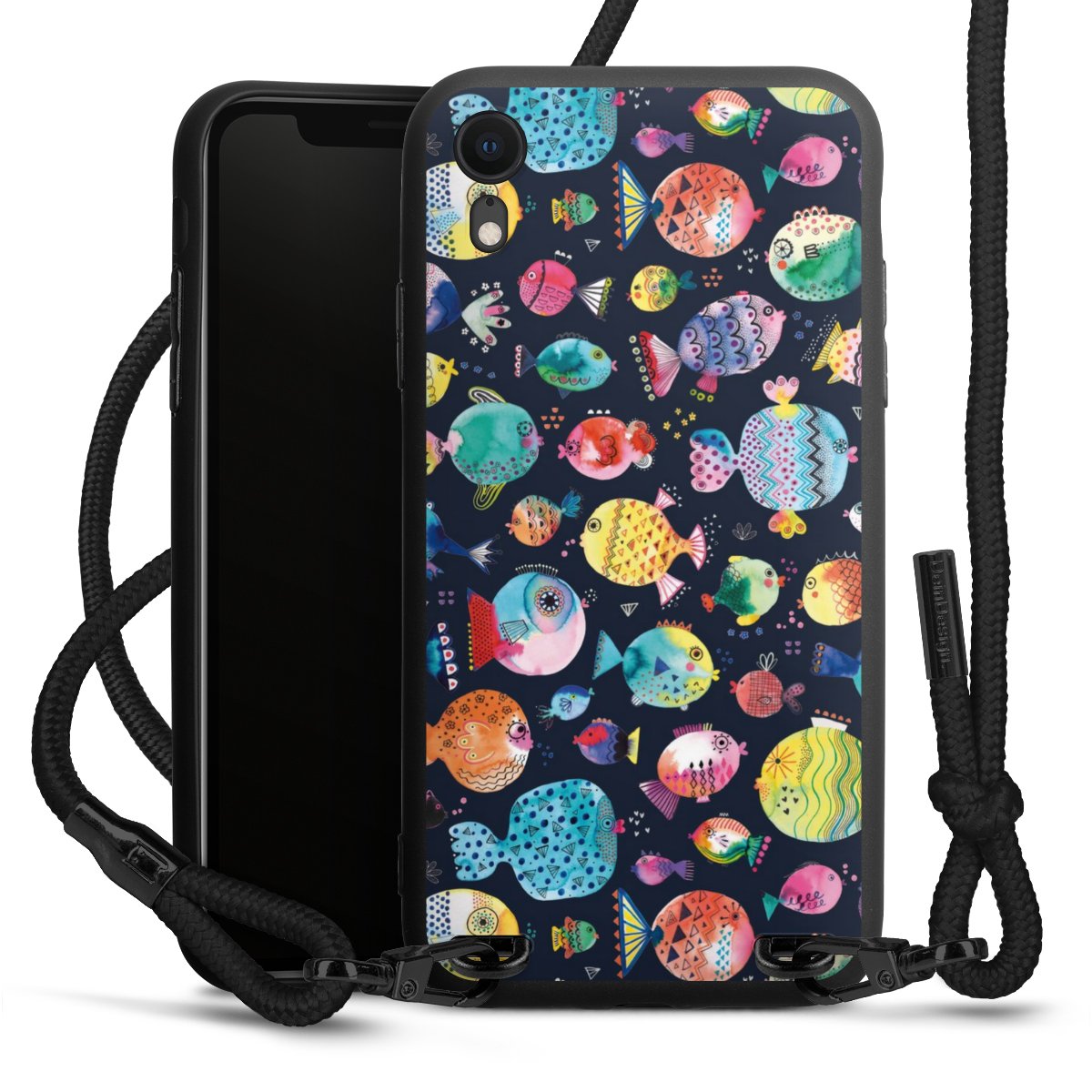 Pure Black: Handyhülle, Stoffband und Metalldetails in stylischem Mattschwarz.