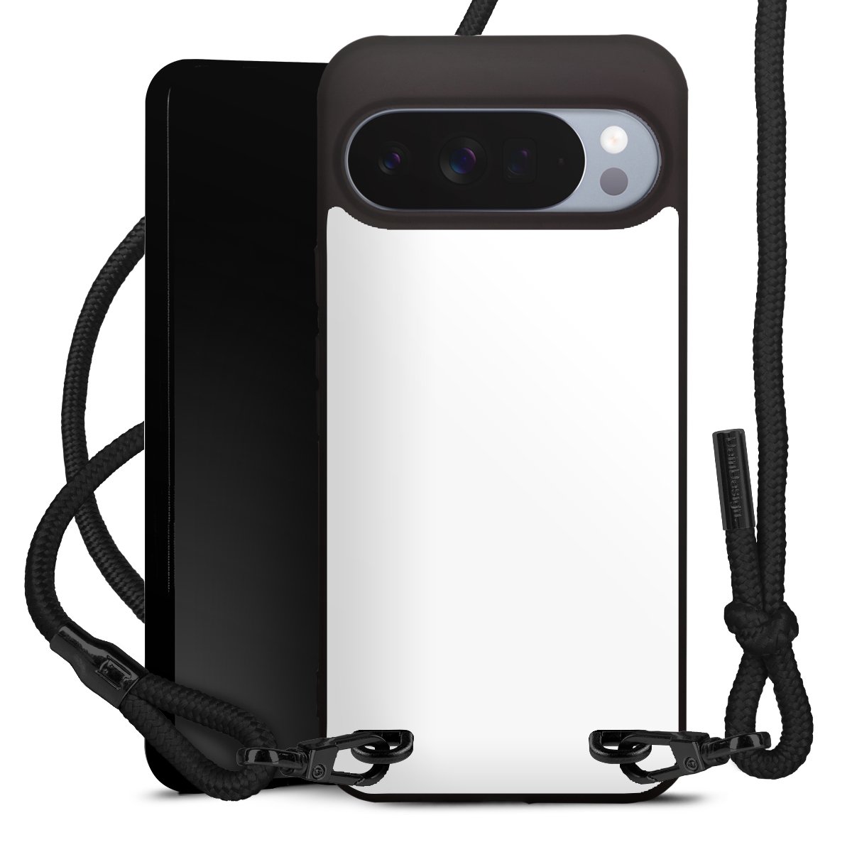Pure Black: Handyhülle, Stoffband und Metalldetails in stylischem Mattschwarz.
