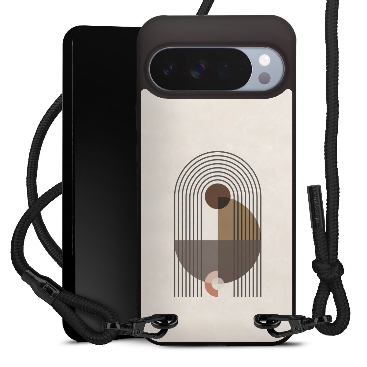Pure Black: Handyhülle, Stoffband und Metalldetails in stylischem Mattschwarz.