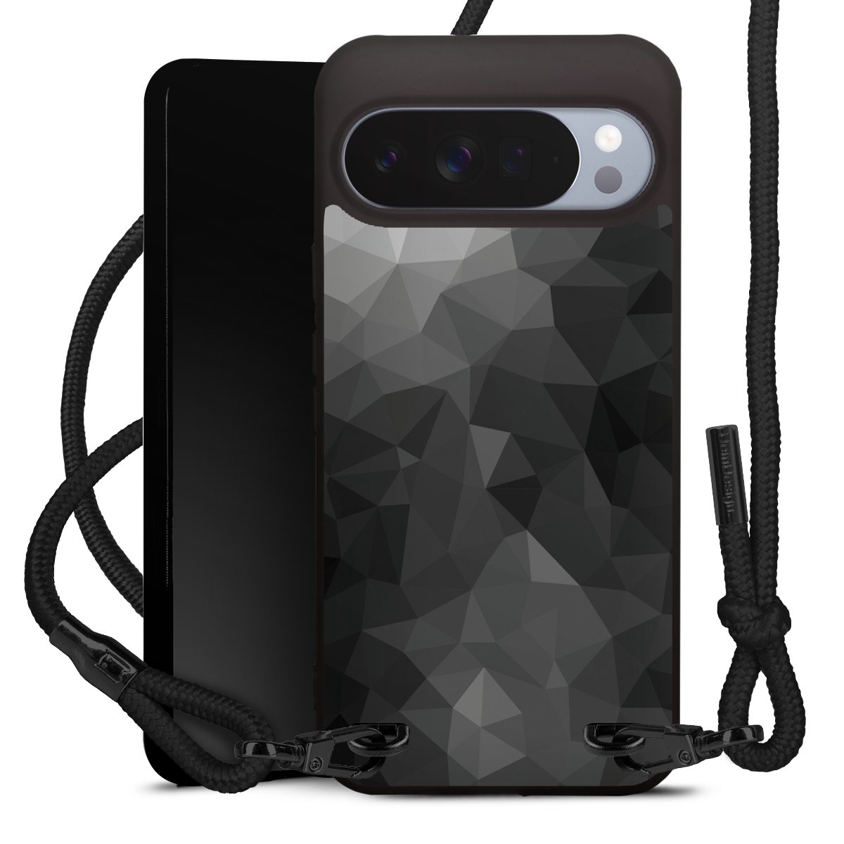 Pure Black: Handyhülle, Stoffband und Metalldetails in stylischem Mattschwarz.