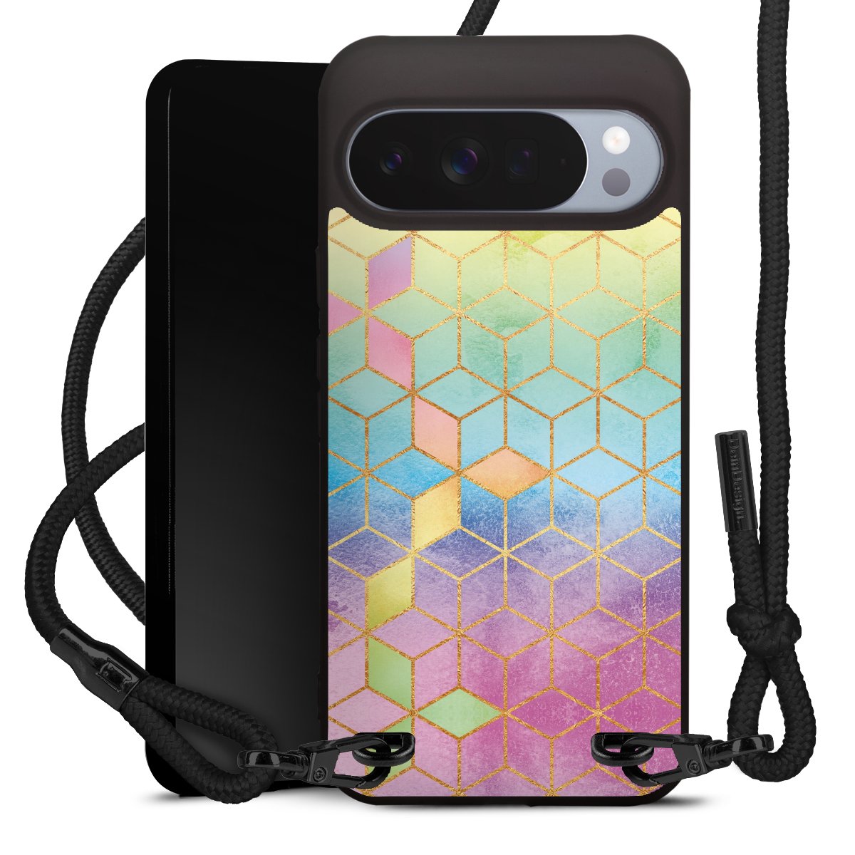 Pure Black: Handyhülle, Stoffband und Metalldetails in stylischem Mattschwarz.