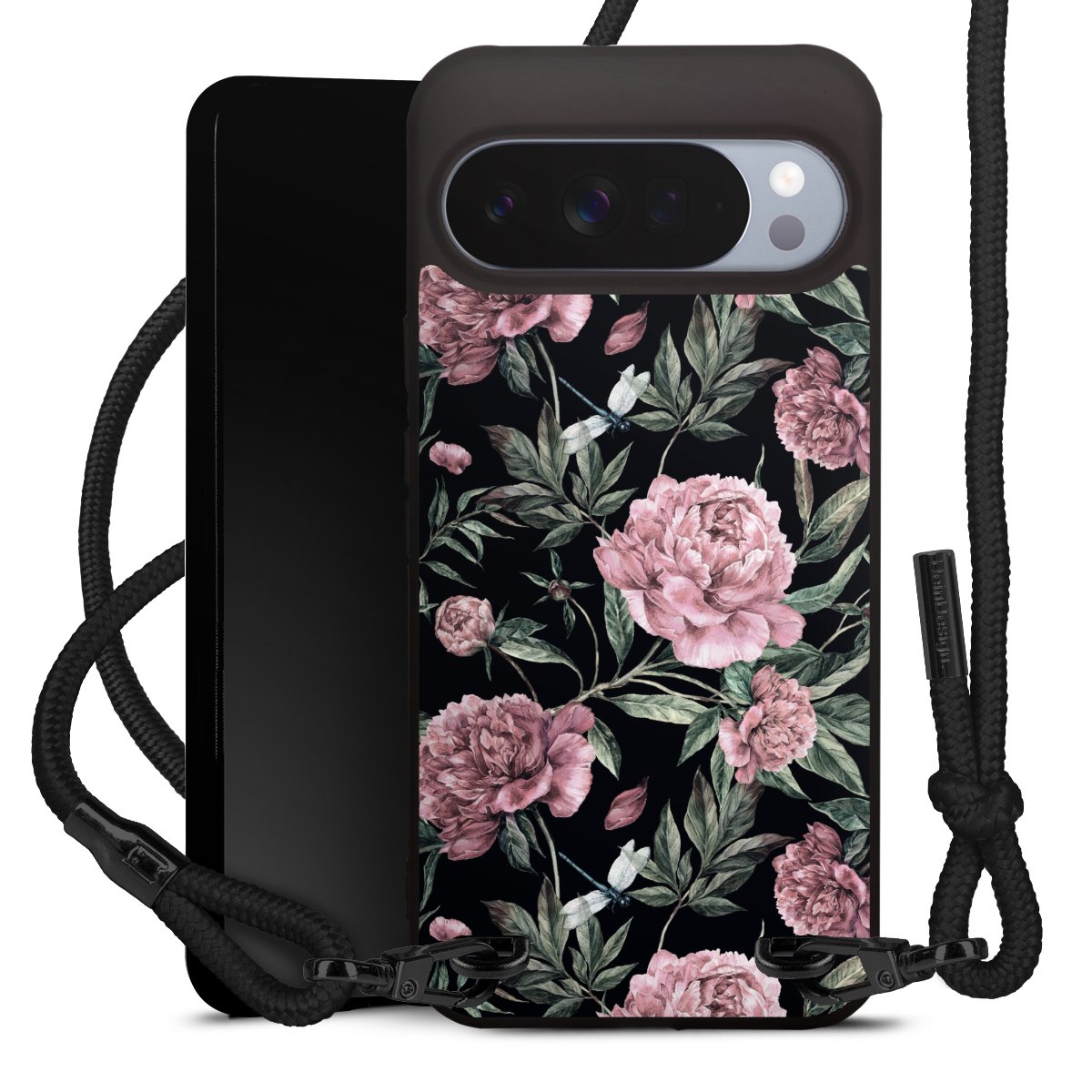 Pure Black: Handyhülle, Stoffband und Metalldetails in stylischem Mattschwarz.