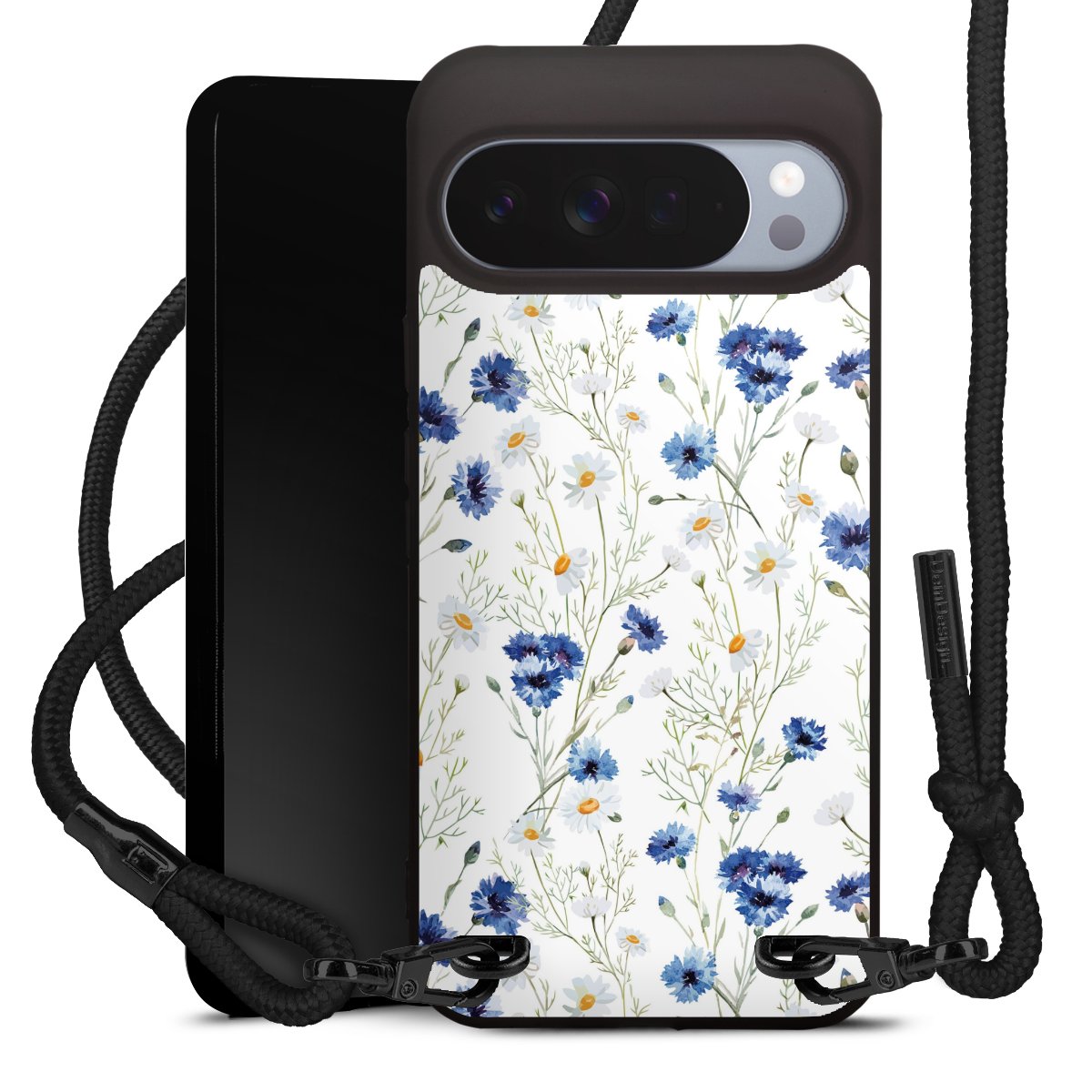 Pure Black: Handyhülle, Stoffband und Metalldetails in stylischem Mattschwarz.