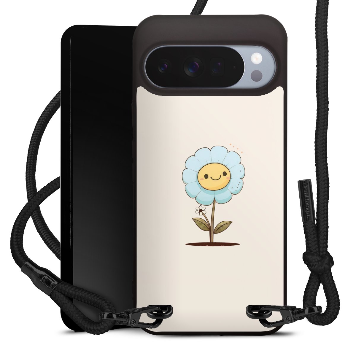 Pure Black: Handyhülle, Stoffband und Metalldetails in stylischem Mattschwarz.