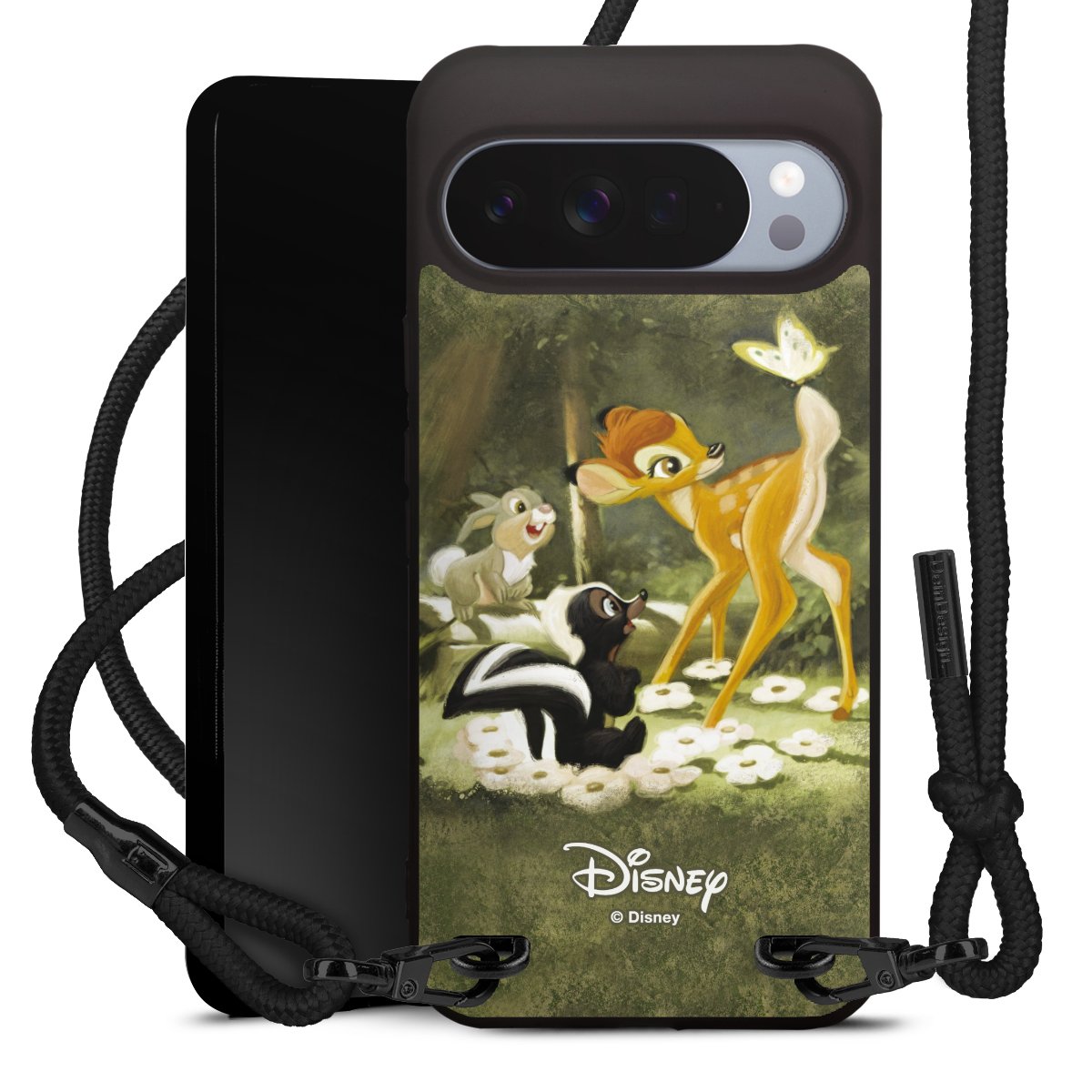 Pure Black: Handyhülle, Stoffband und Metalldetails in stylischem Mattschwarz.