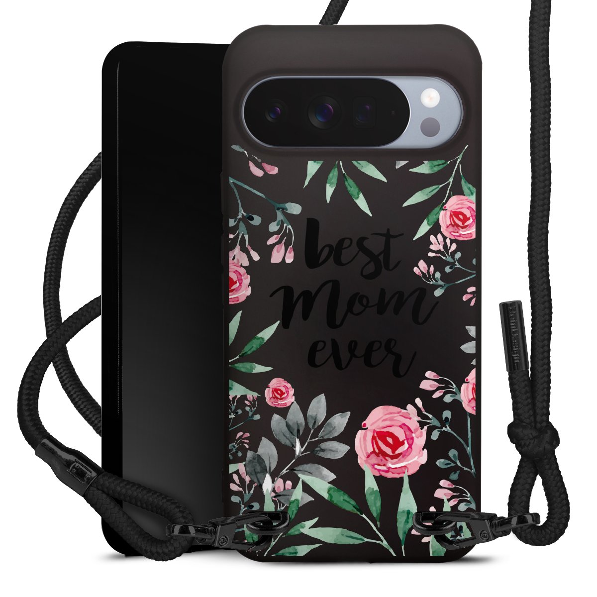 Pure Black: Handyhülle, Stoffband und Metalldetails in stylischem Mattschwarz.