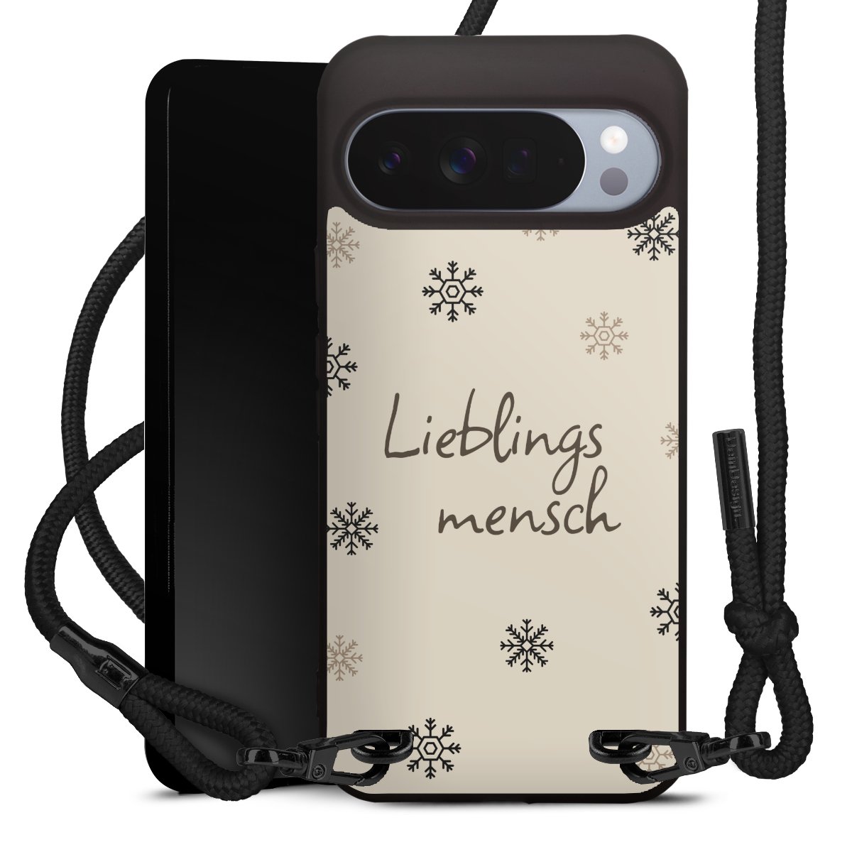 Pure Black: Handyhülle, Stoffband und Metalldetails in stylischem Mattschwarz.