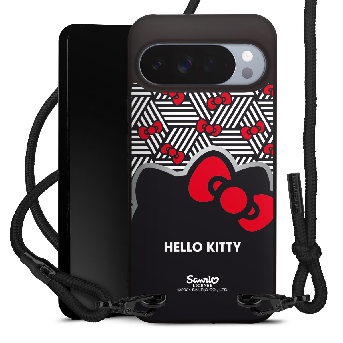 Pure Black: Handyhülle, Stoffband und Metalldetails in stylischem Mattschwarz.