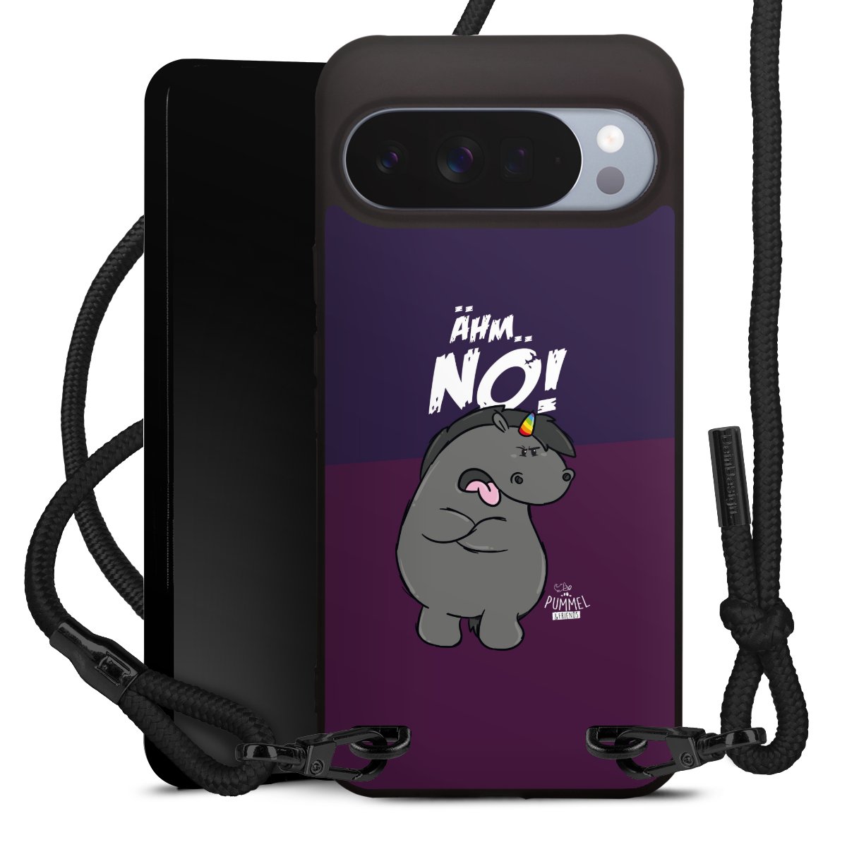 Pure Black: Handyhülle, Stoffband und Metalldetails in stylischem Mattschwarz.