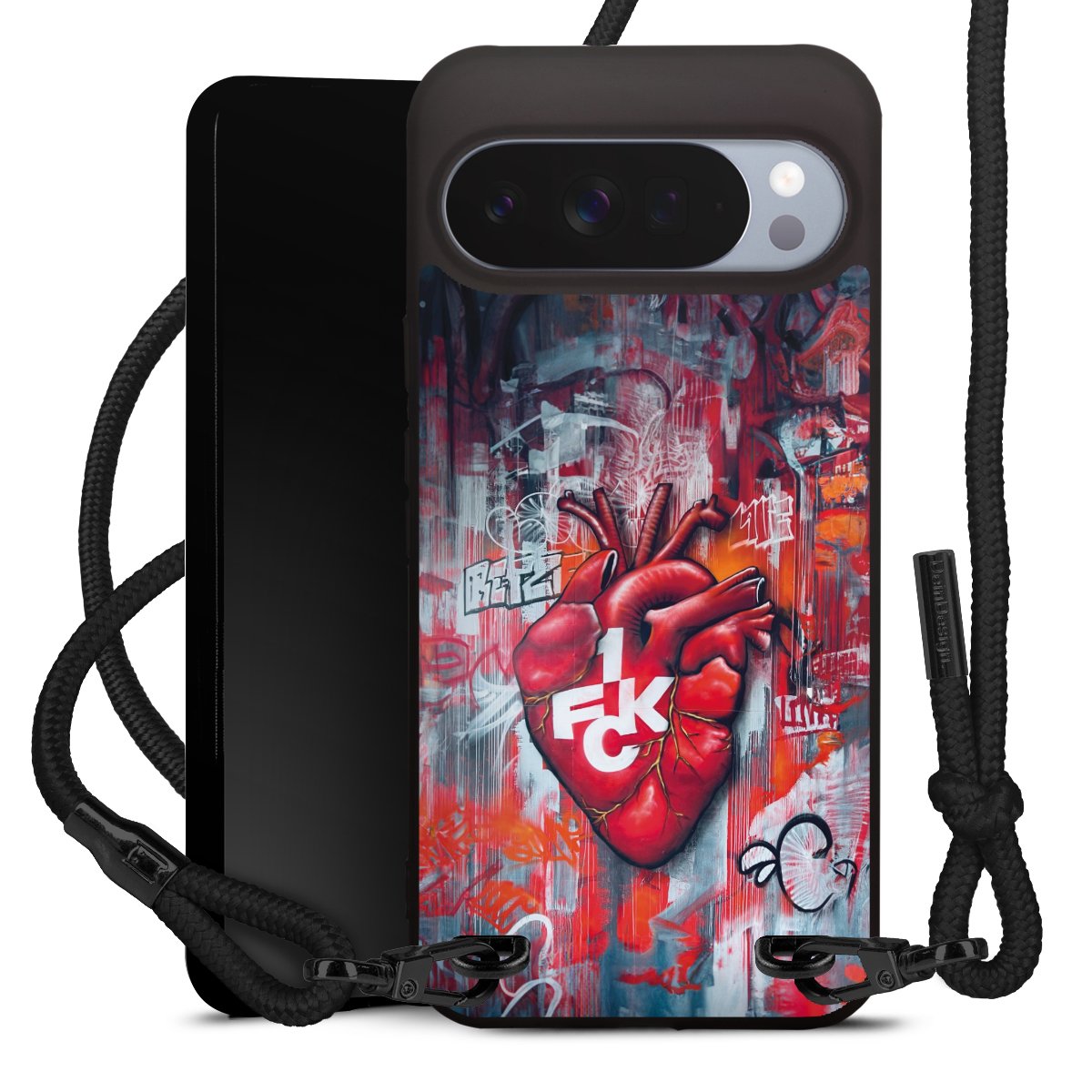 Pure Black: Handyhülle, Stoffband und Metalldetails in stylischem Mattschwarz.