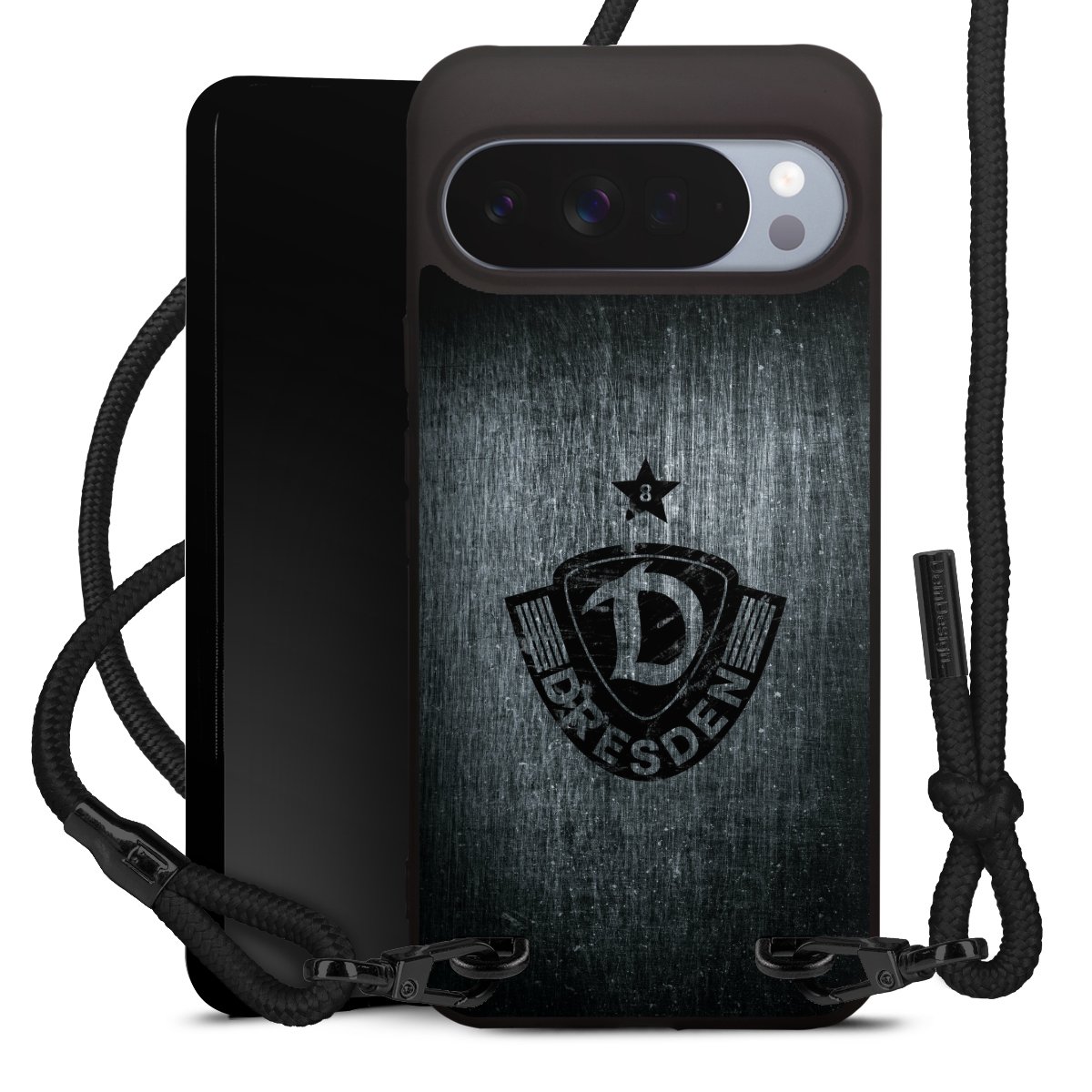 Pure Black: Handyhülle, Stoffband und Metalldetails in stylischem Mattschwarz.