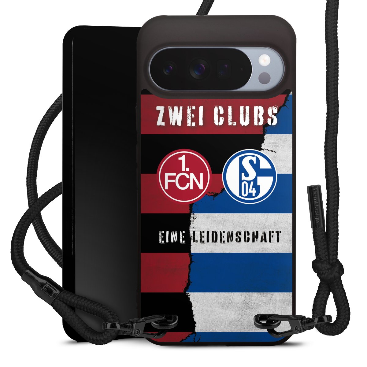 Pure Black: Handyhülle, Stoffband und Metalldetails in stylischem Mattschwarz.