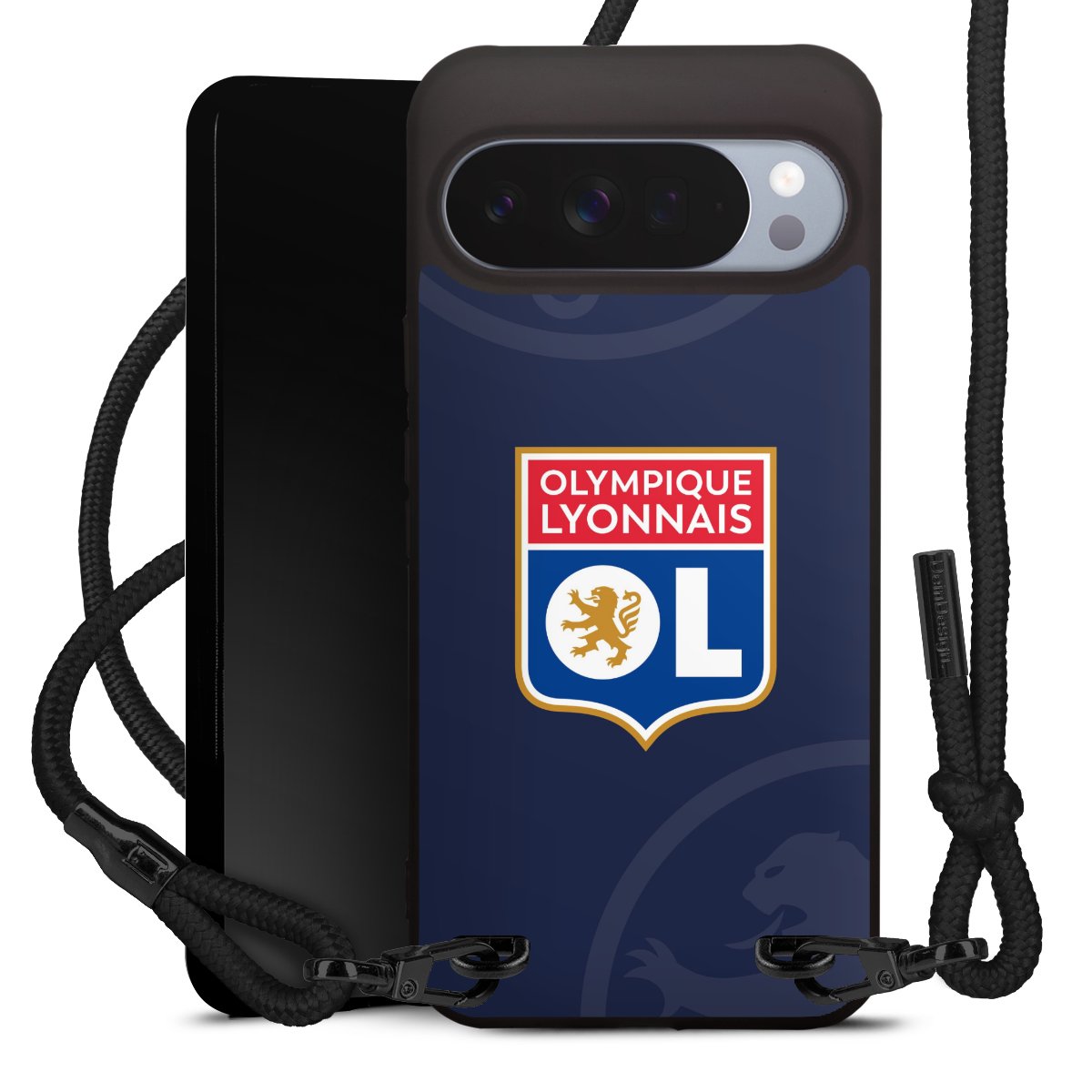 Pure Black: Handyhülle, Stoffband und Metalldetails in stylischem Mattschwarz.