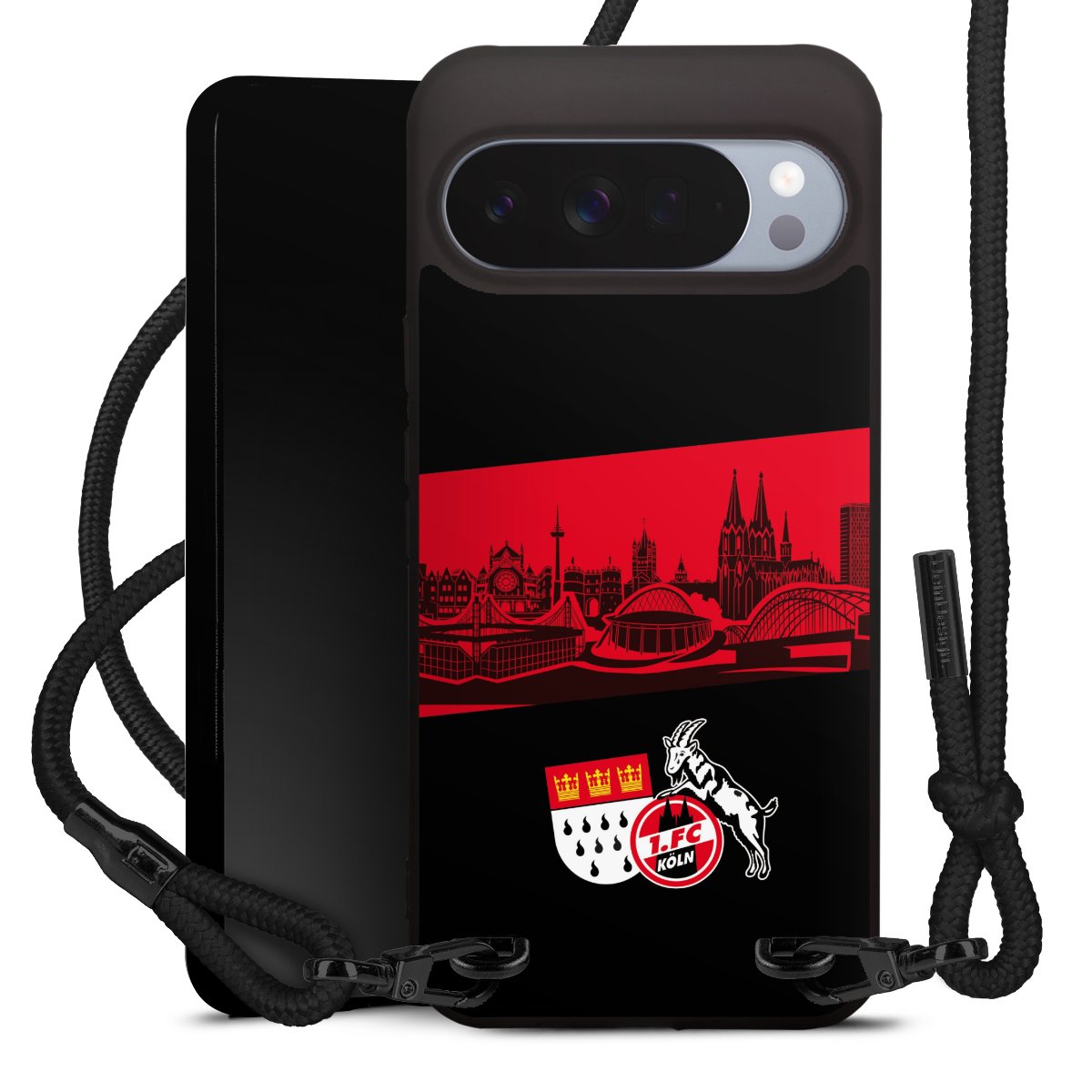 Pure Black: Handyhülle, Stoffband und Metalldetails in stylischem Mattschwarz.