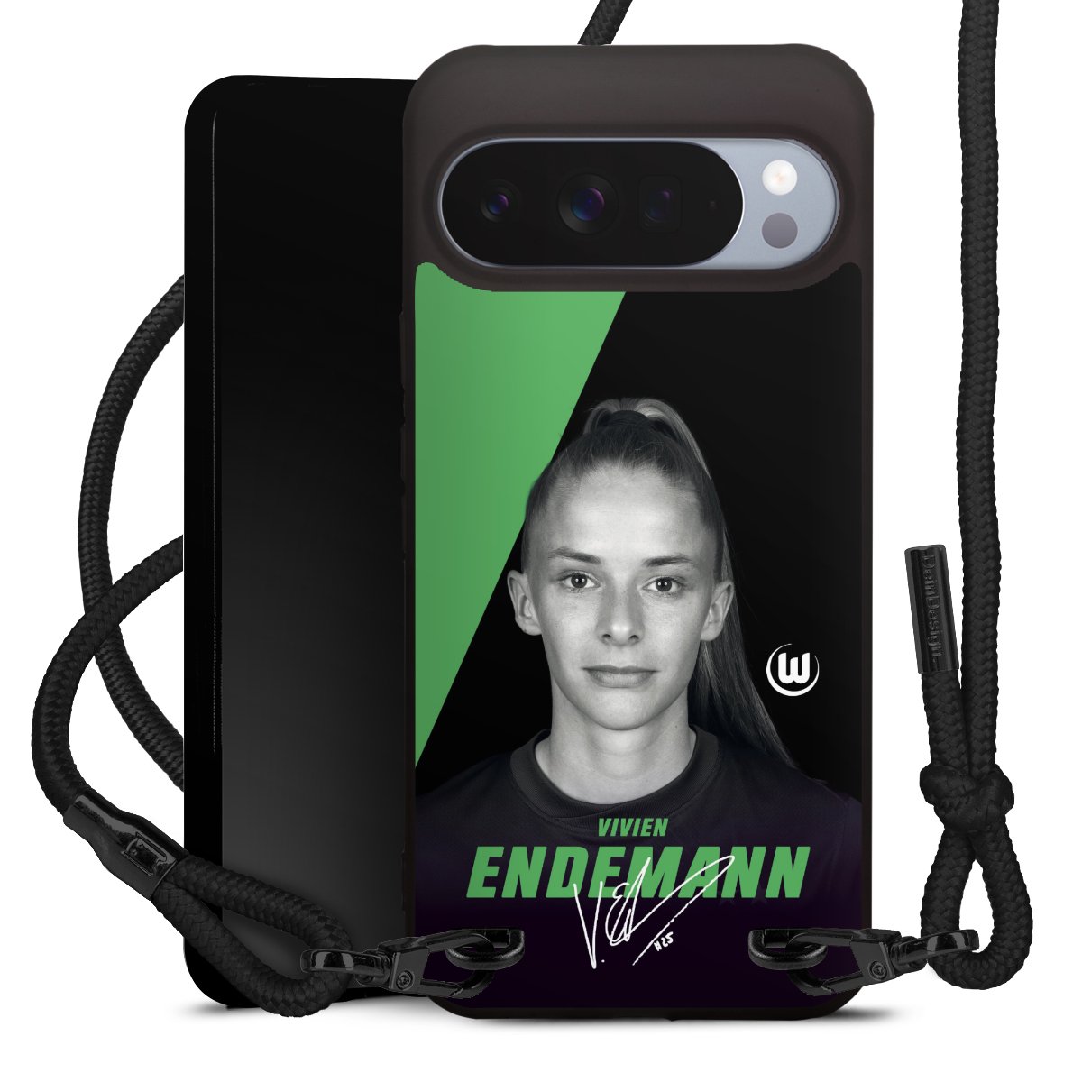 Pure Black: Handyhülle, Stoffband und Metalldetails in stylischem Mattschwarz.