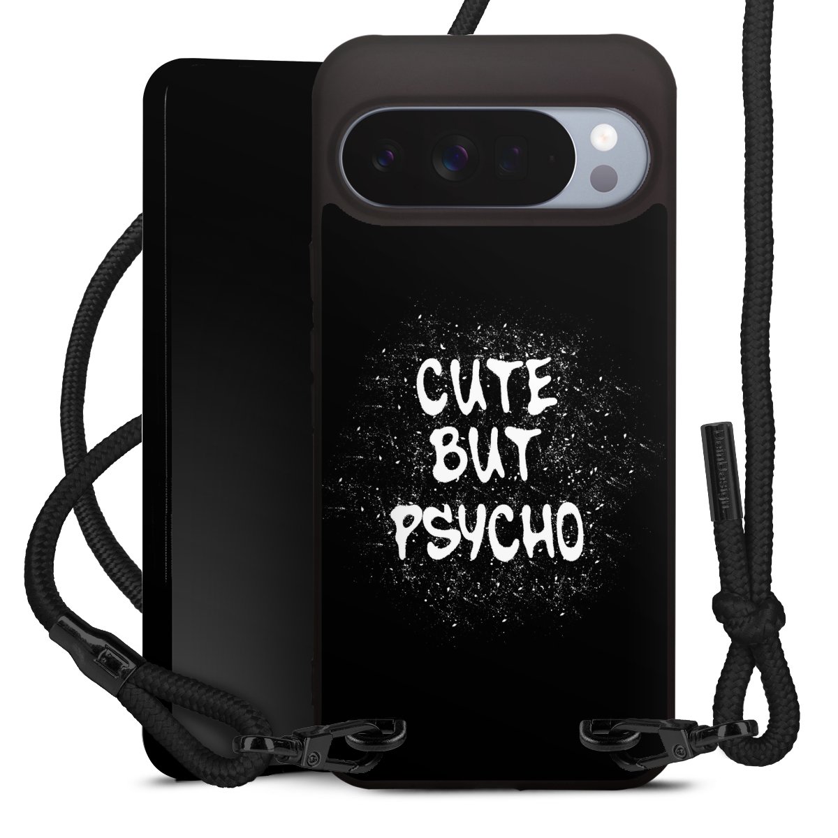 Pure Black: Handyhülle, Stoffband und Metalldetails in stylischem Mattschwarz.