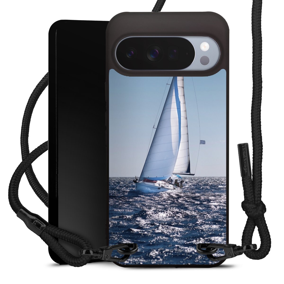 Pure Black: Handyhülle, Stoffband und Metalldetails in stylischem Mattschwarz.