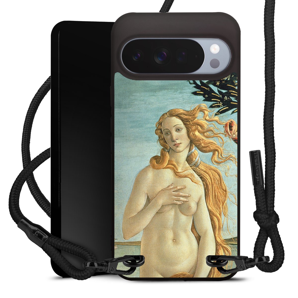 Pure Black: Handyhülle, Stoffband und Metalldetails in stylischem Mattschwarz.