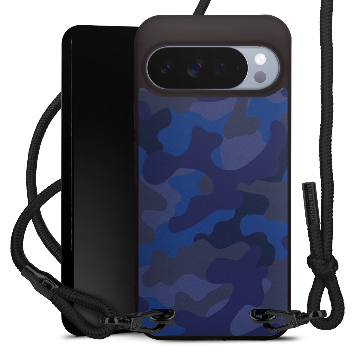 Pure Black: Handyhülle, Stoffband und Metalldetails in stylischem Mattschwarz.