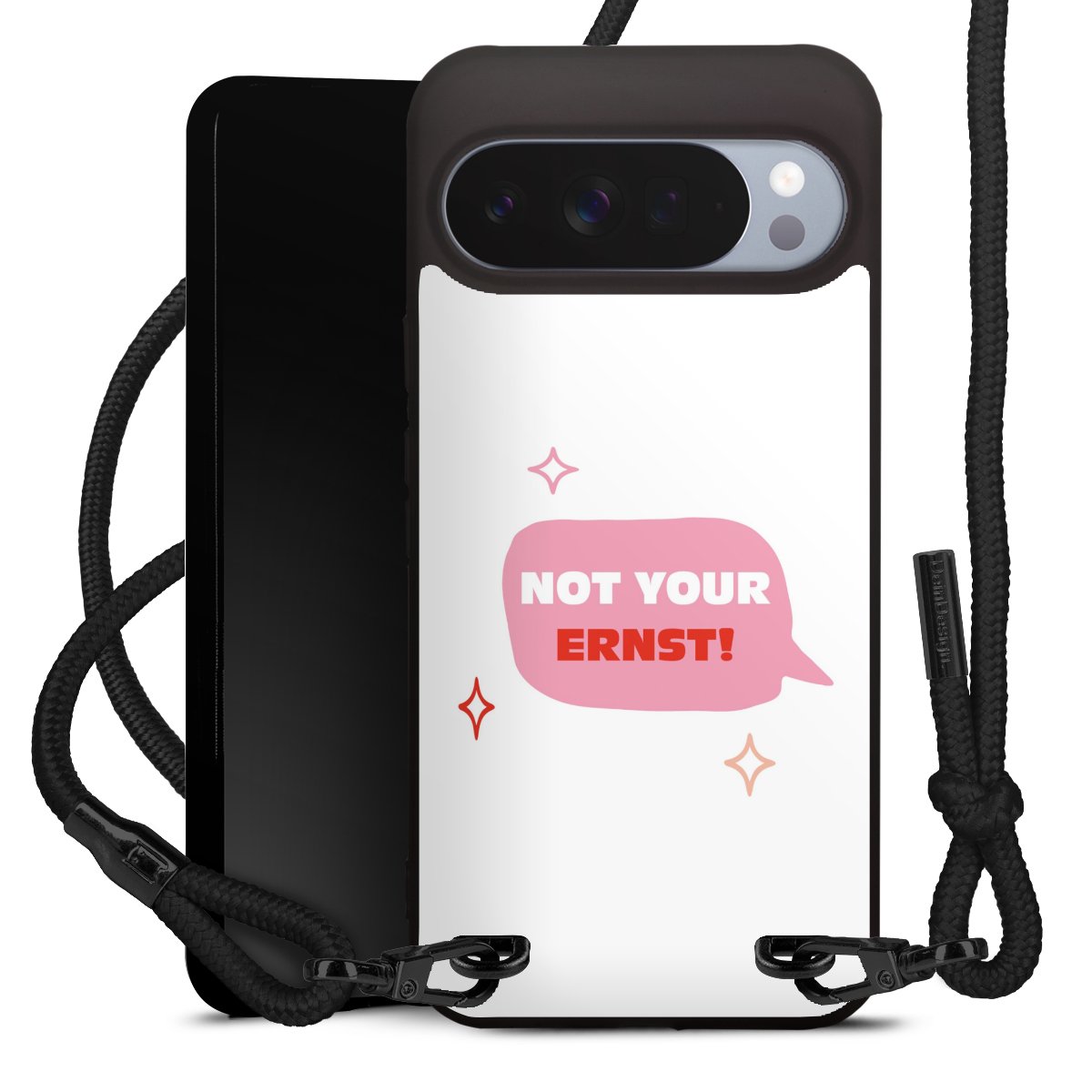 Pure Black: Handyhülle, Stoffband und Metalldetails in stylischem Mattschwarz.