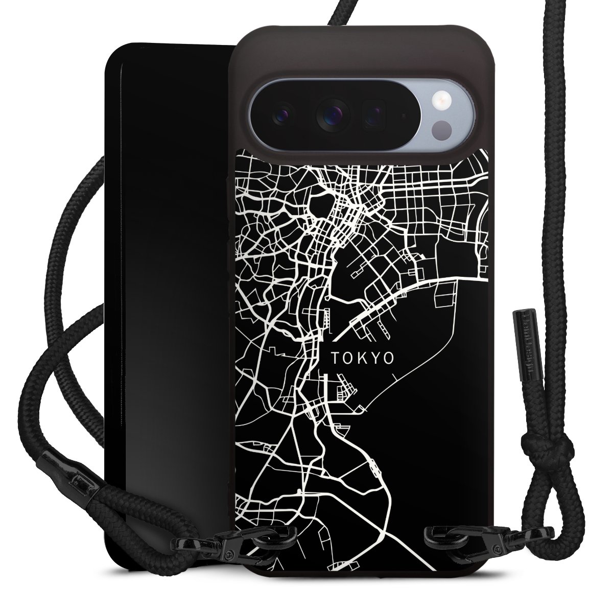 Pure Black: Handyhülle, Stoffband und Metalldetails in stylischem Mattschwarz.