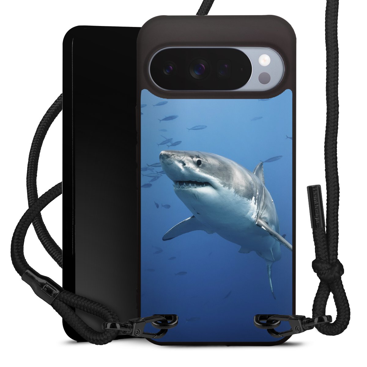 Pure Black: Handyhülle, Stoffband und Metalldetails in stylischem Mattschwarz.