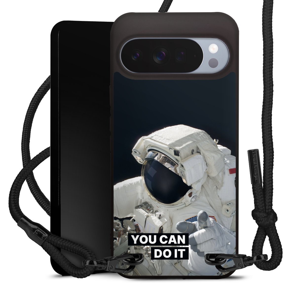 Pure Black: Handyhülle, Stoffband und Metalldetails in stylischem Mattschwarz.
