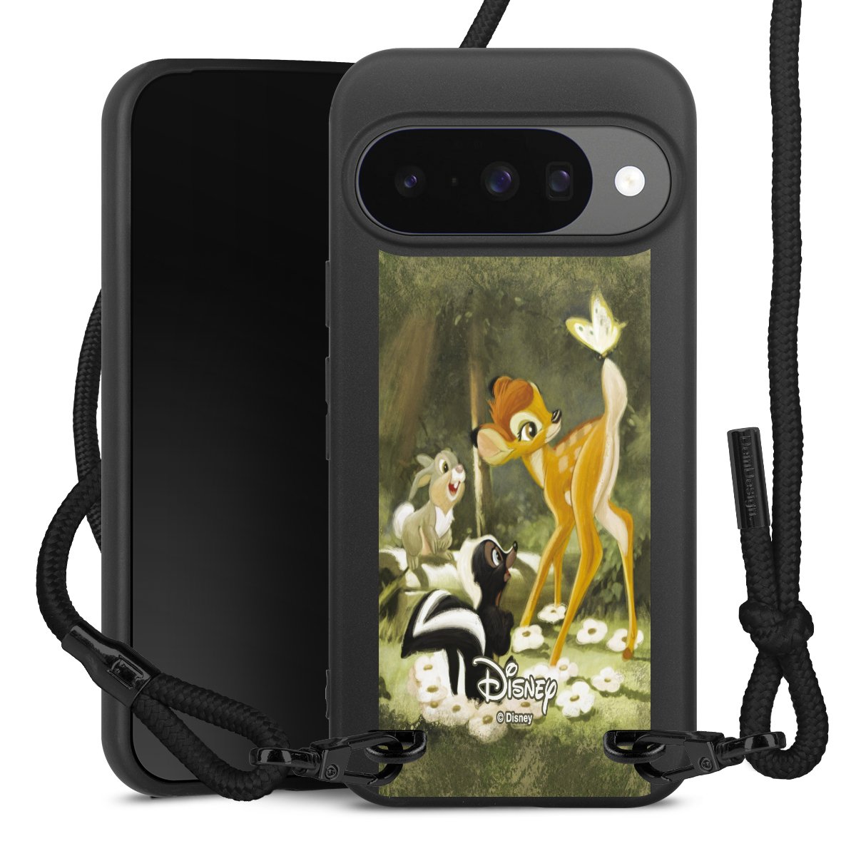 Pure Black: Handyhülle, Stoffband und Metalldetails in stylischem Mattschwarz.