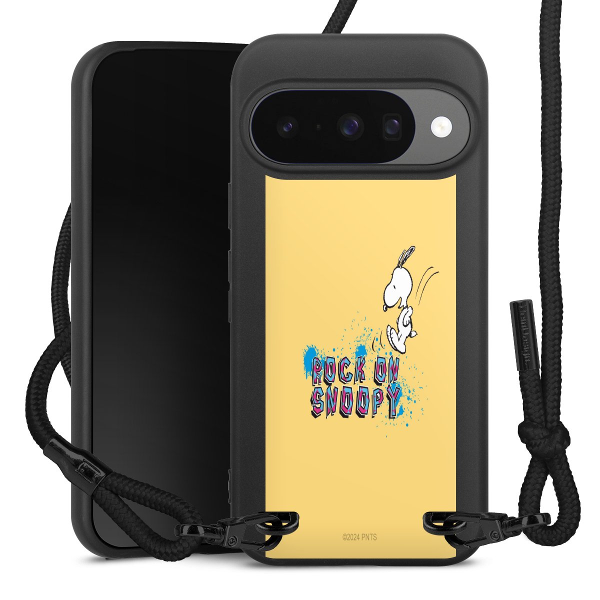 Pure Black: Handyhülle, Stoffband und Metalldetails in stylischem Mattschwarz.