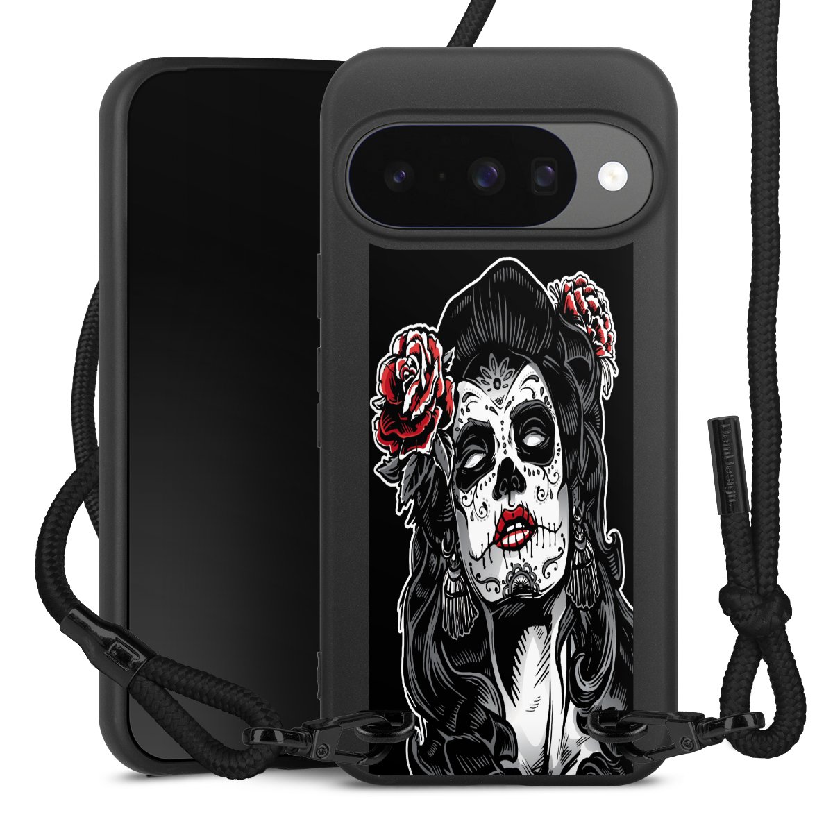 Pure Black: Handyhülle, Stoffband und Metalldetails in stylischem Mattschwarz.