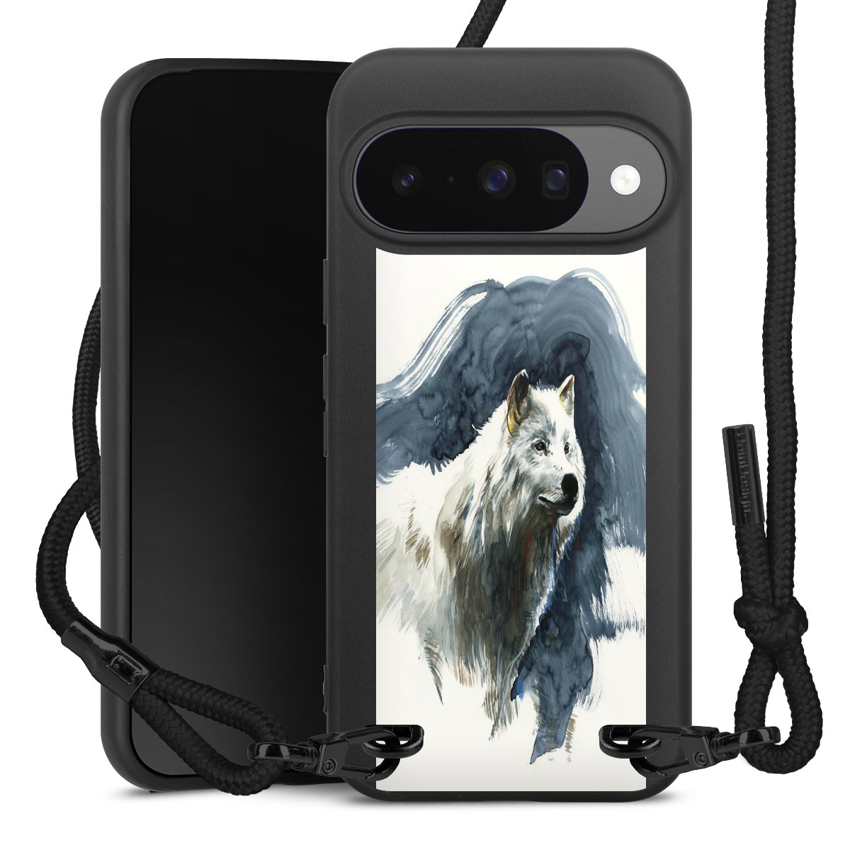 Pure Black: Handyhülle, Stoffband und Metalldetails in stylischem Mattschwarz.